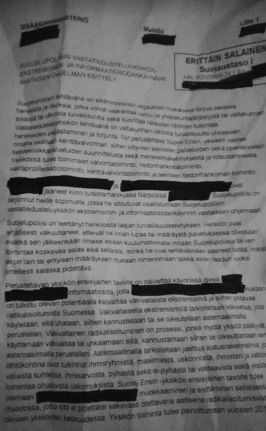 Supo-asiakirja on erittäin salainen julkisuuteen vuotanut Suomen Suojelupoliisin asiakirja. Se paljastaa, että kaksi vuonna 1998 Närpiössä kiinni jäänyttä "kettutyttöä" on värvätty SuPo:n palvelukseen, ja he ovat näin välttäneet tuomion turkistarhaiskusta. SuPo on antanut heille määräyksen perustaa Suomi Ensin -ryhmän, jonka tarkoitus on saattaa isänmaalliset huonoon valoon.